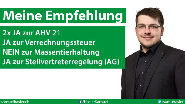 2x JA zur AHV 21 Revision JA zur Verrechnungssteuerrevision NEIN zur Massentierhaltunginitiative JA zur Stellvertreterregelung (Kantonale Vorlage Aargau)